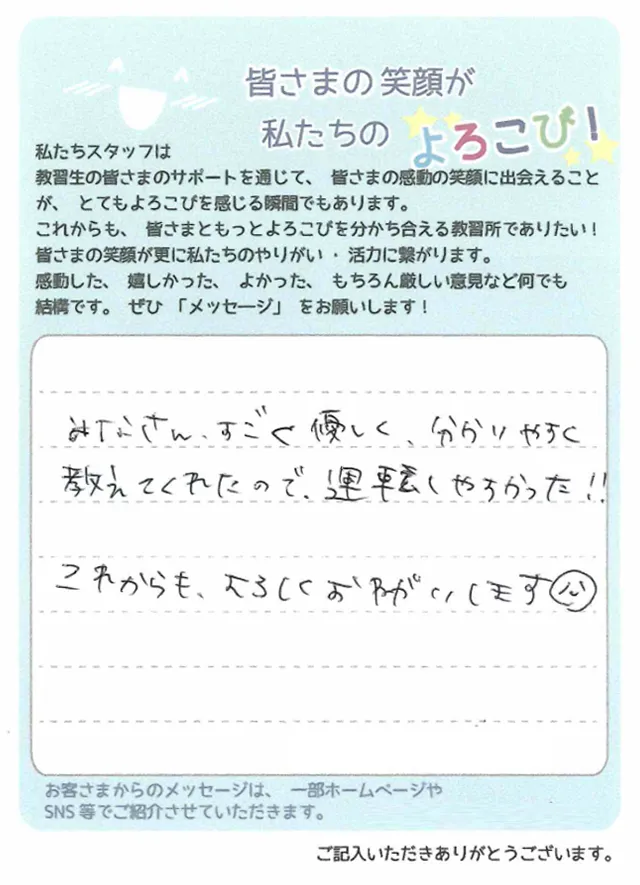 指導員の方や受付の方、皆さんがとても丁寧に教えて下さったので、怖かった運転が今では日々のストレスを発散できるくらい楽しんで運転できています。ありがとうございます。