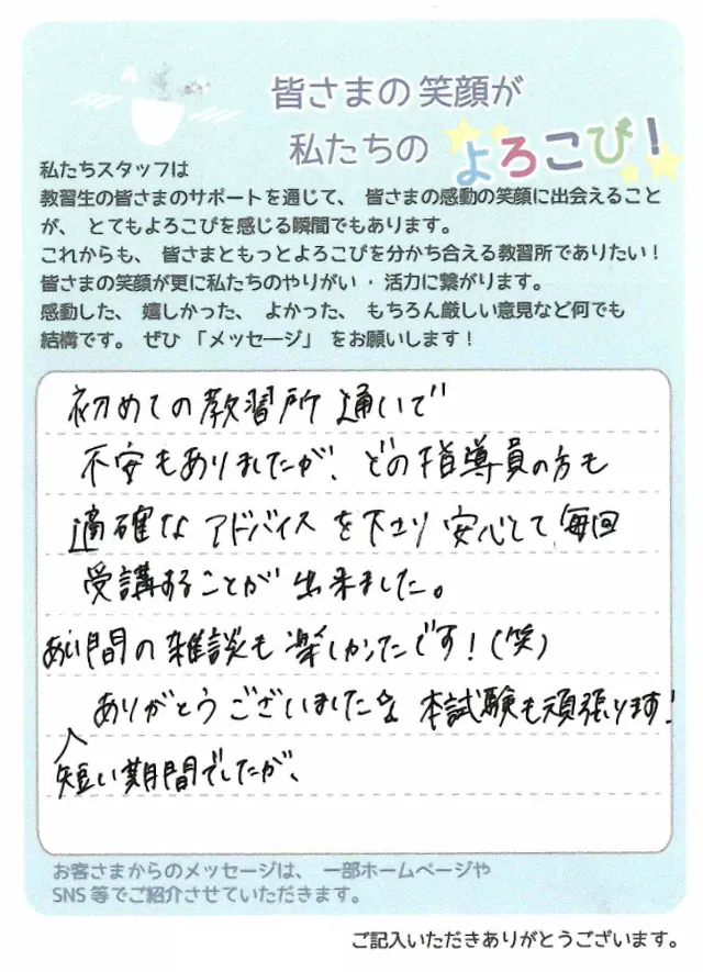 初めての教習所通いで不安もありましたが、どの指導員も的確なアドバイスを下さり安心して毎回受講することが出来ました。合間の雑談も楽しかったです!短い期間でしたがありがとうございました。本試験も頑張ります!