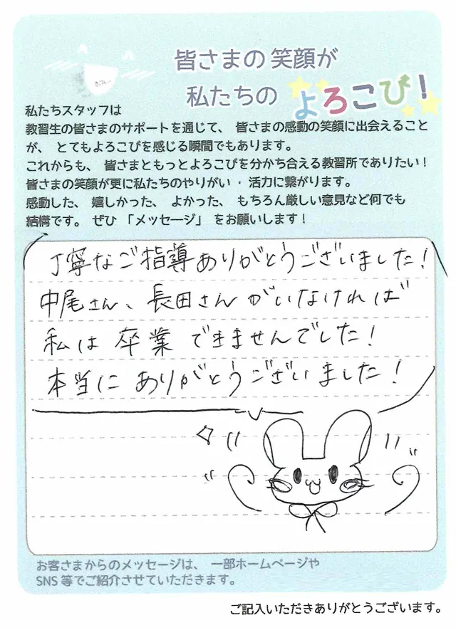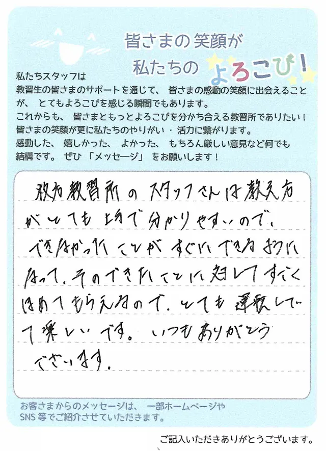 本日で教習所を卒業します。運転にはきっと向いていないだろうから、不安だなと感じながら入学しました。しかし、先生方は1つ1つ丁寧に優しく教えてくださり、教習所に来て運転することがとても楽しかったです。送迎バスの藤田さんには生き帰りとても楽しくお話しさせていただき、いつも親切にしていただき嬉しかったです。本当にお世話になりました。ありがとうございました。