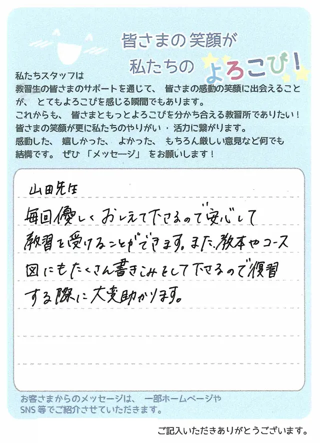 的確に直すべき所を教えていただき、ありがとうございます。また、楽しく教えていただくことが多く、教習中も気楽に受けることができました。何かの折にはお願い致します。