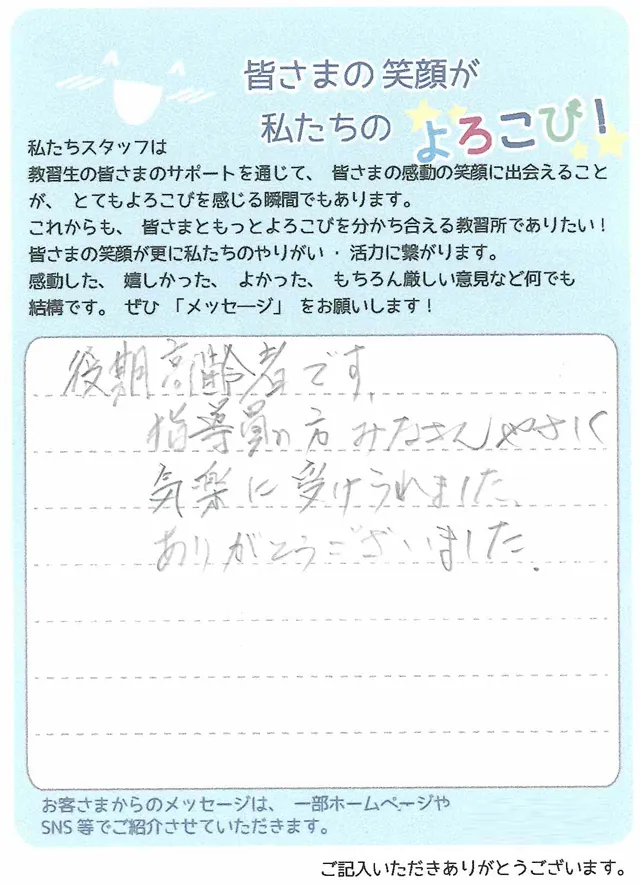50歳を過ぎての教習所通いは周りが若い方達ばかりで気恥ずかしさもあり、毎回、緊張と不安ばかりでしたが指導員の方々の丁寧なご指導のおかげで卒業の日を迎える事ができました。本当にありがとうございました。