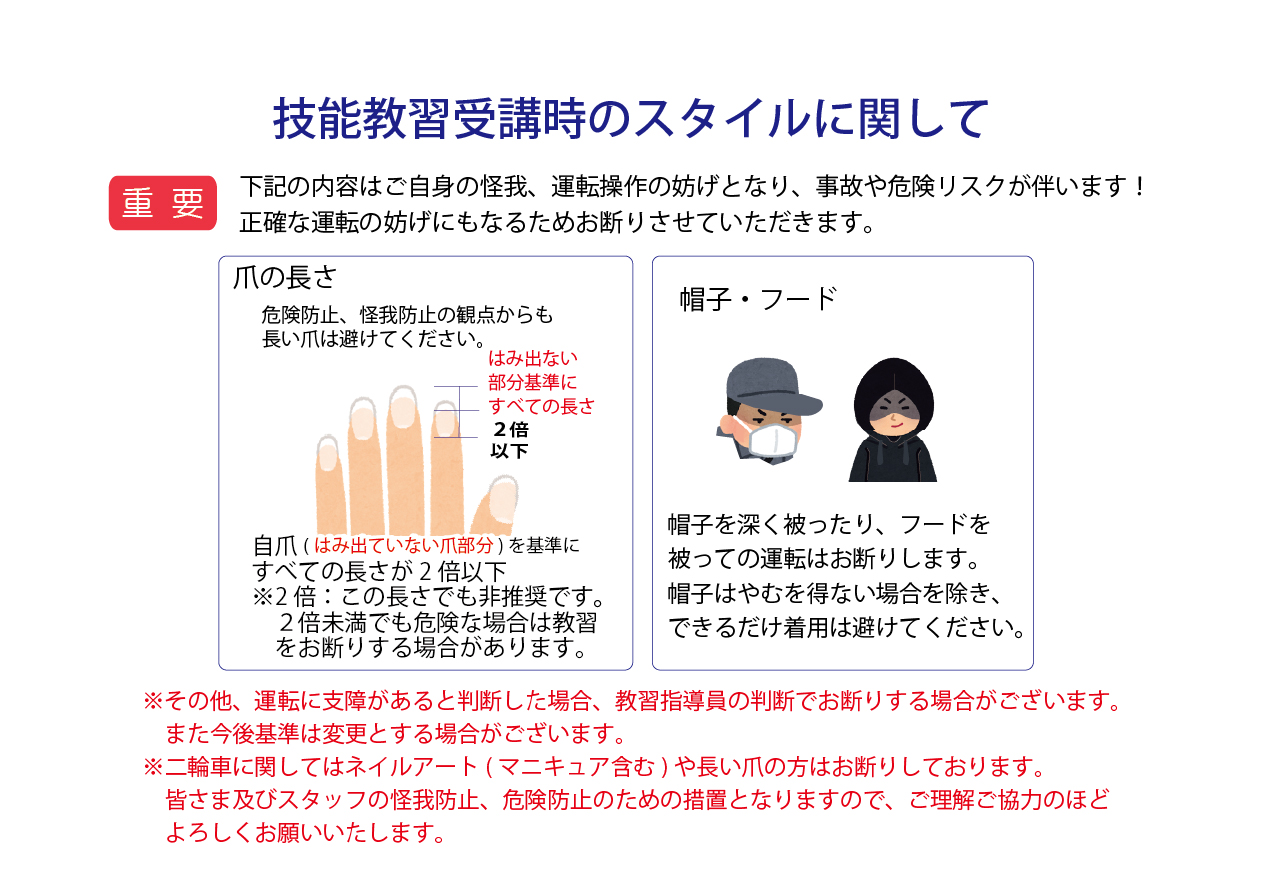 技能教習時のスタイルに関して(爪・帽子など)